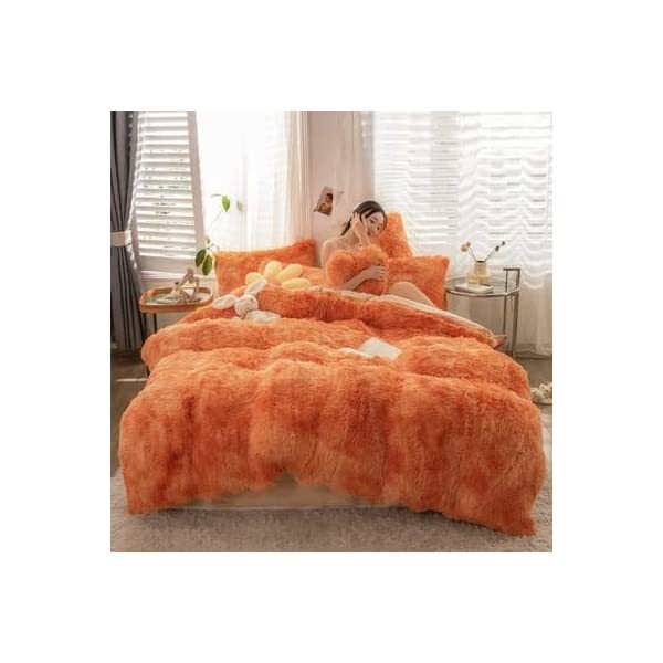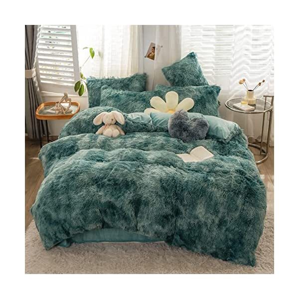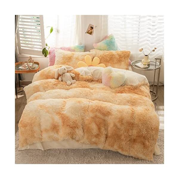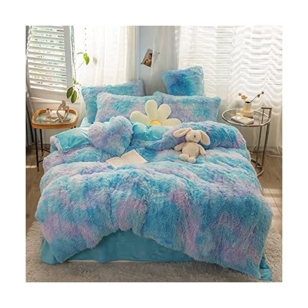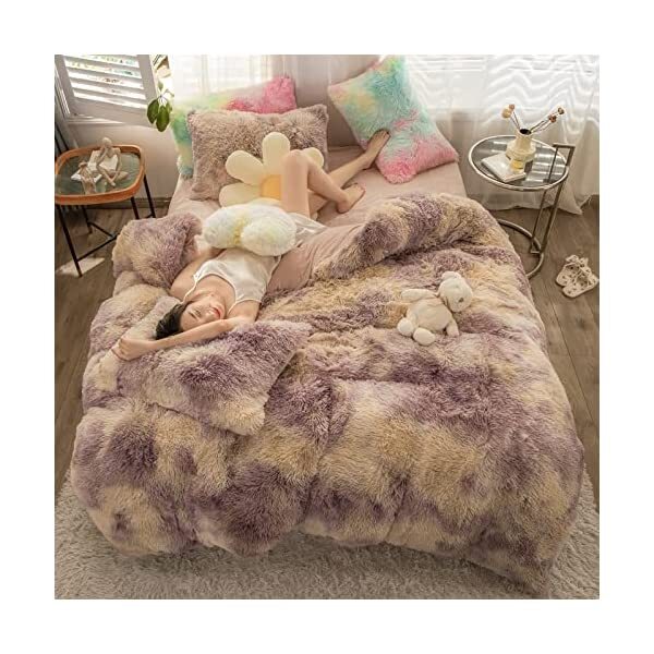 【EASY TO WASH】Cold wash machine. Gentle cycle. Tumble dry low. Do not bleach. Cool Iron when needed after wash. We advise you wash the set and using fabric softener before putting it over your comforter. 【ZIPPER & TIE】Strong and Sturdy metal zipper reduce your time on bed making process to seal your quilt, comforter or duvet easier and quicker than regular button closure. Ribbon ties in the four corners help to to ensure your comforter fit cover properly even if you move constantly at night. 【HIGH QUALITY FABRIC】The front of the elegant duvet cover is made of microfiber long plush while the back is ultra soft crystal velvet fabric which will make you warm and cozy promptly during the cold weather, luxury touch to your sleeping space with the smooth. 【WHAT YOU CAN GET】: 4 PCS shaggy fluffy queen size bedding set, 2PC pillow cases 19" x 30", Soft Duvet cover dimension 96" x 98"/100", Matching cozy pillow sham dimension 19"x30". 【PLUSH DUVET COVER】This high quality comfy faux fur duvet cover does not shed. Using the duvet cover without a duvet inside on warm summer and put down comforter inside in the colder months. A great gift for everybody, every festival and special occasion, perfectly decorate your room in a comfortable and fashionable way.